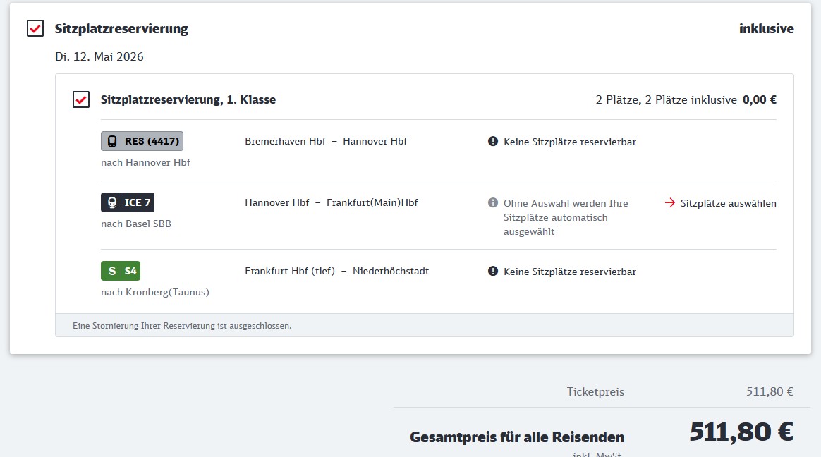 Gemäß regulärem Tarif für das sogenannte Flex-Ticket, eine Fahrkarte ohne Zugbindung hätte einschließlich Platzreservierung 511,80 Euro gekostet, aber so sind wir mit 110,78 Euro davon gekommen.